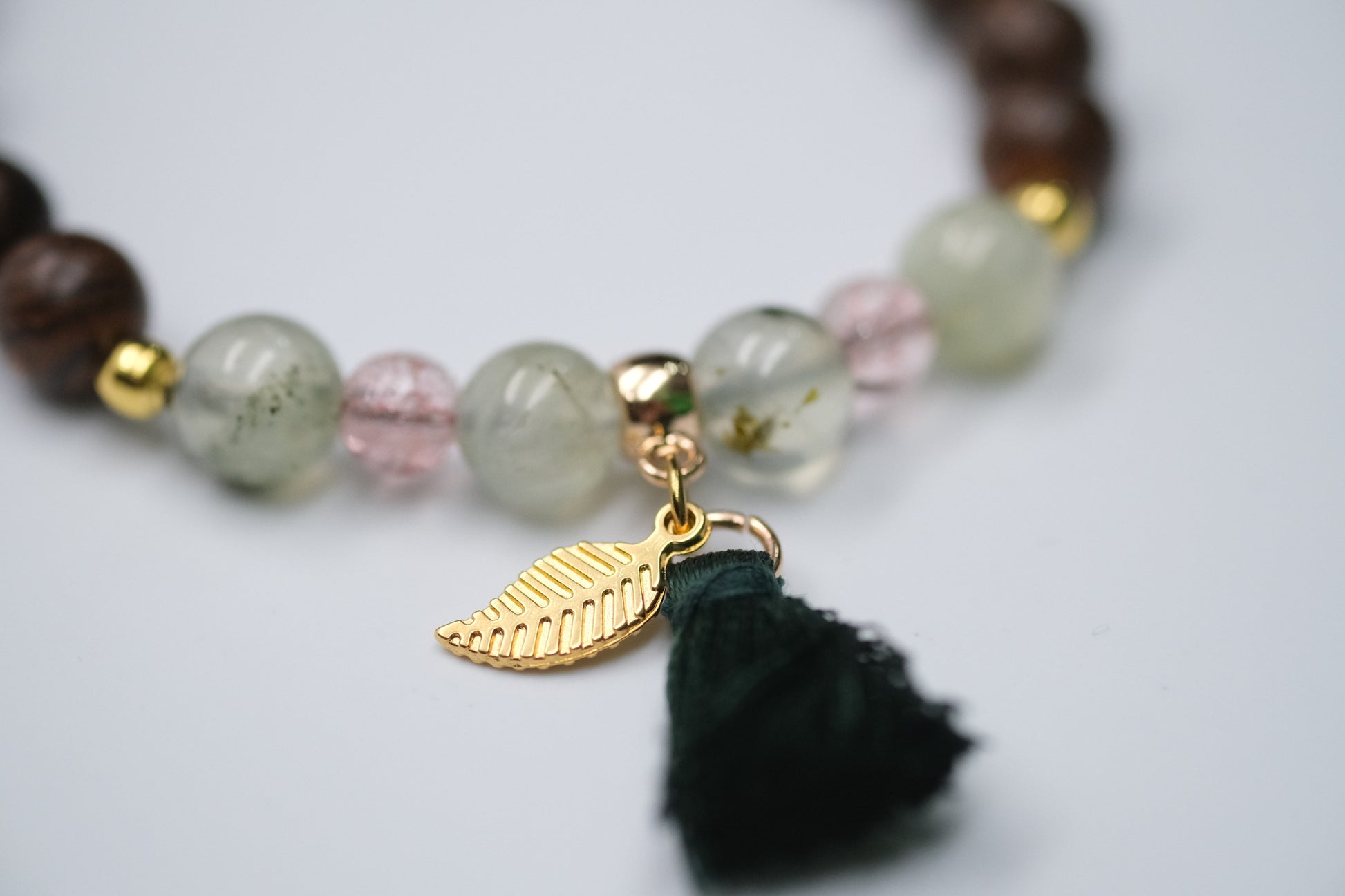 Dieses handgefertigte Armband besteht aus hochwertigen 8mm dunklem Sandelholz und Prehnit Perlen, 4mm vergoldeten Messingperlen, 6mm Glasperlen und einer dunkelgrünen Quaste. Als Anhänger dient ein vergoldetes Blatt. Das stilvolle Armband wird mit einem silbernen Makramee Stoffband befestigt. Ein zeitloses Accessoire mit natürlichen Materialien für eine moderne Note an Ihrem Handgelenk.