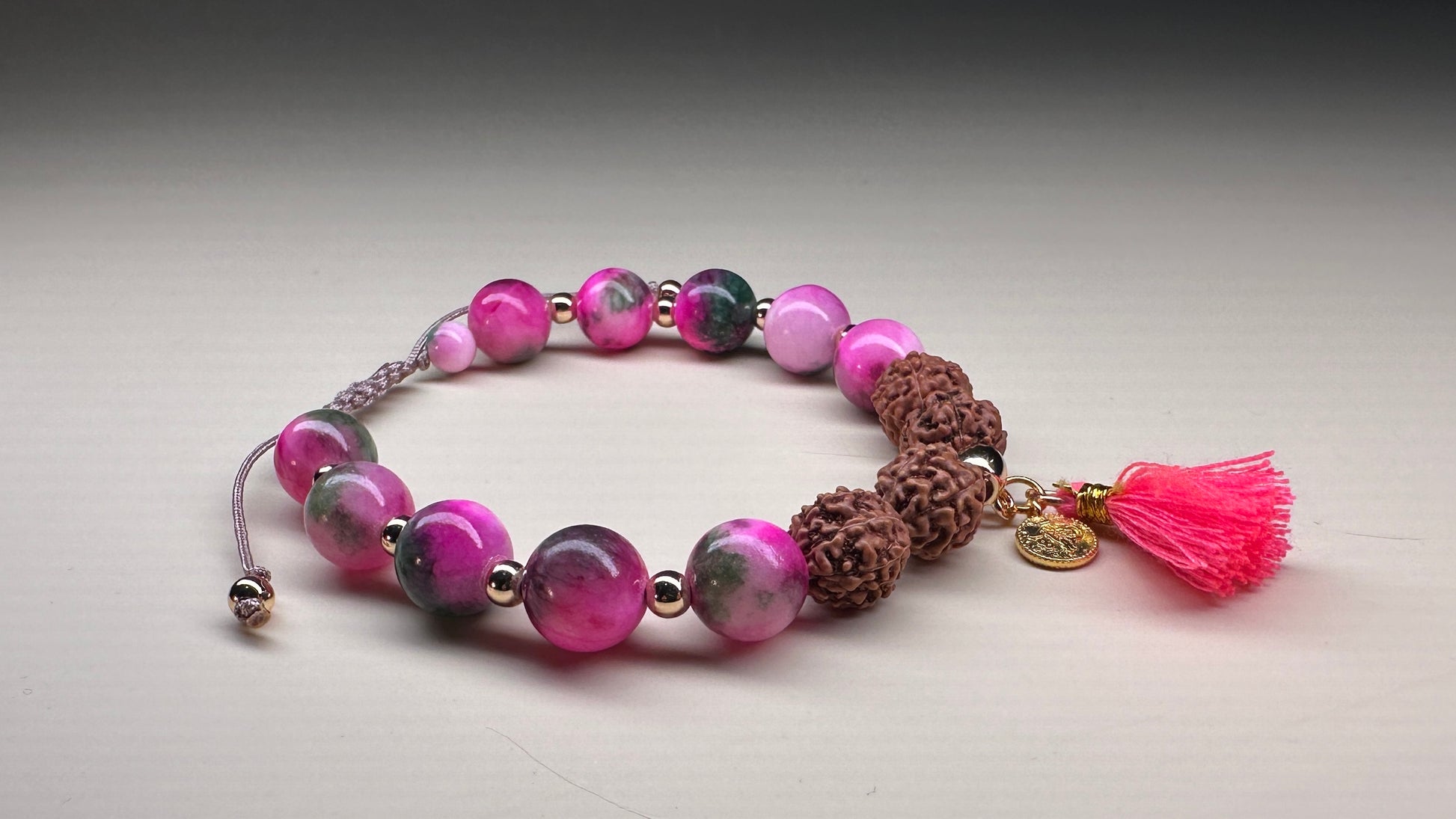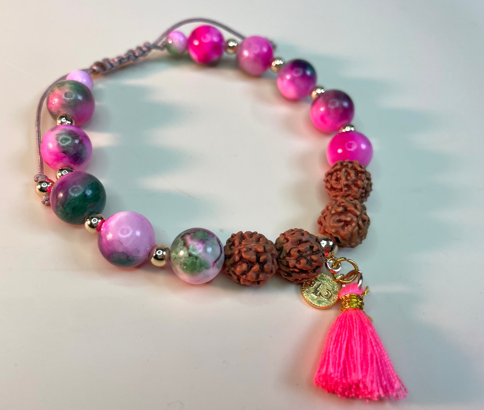 Handgemachtes Armband mit kleinen 6mm und 10mm Malay Jade sowie 10mm Rudraksha Perlen und vergoldeten Details. Als Hingucker eine farblich passende Quaste mit vergoldeter Münze.